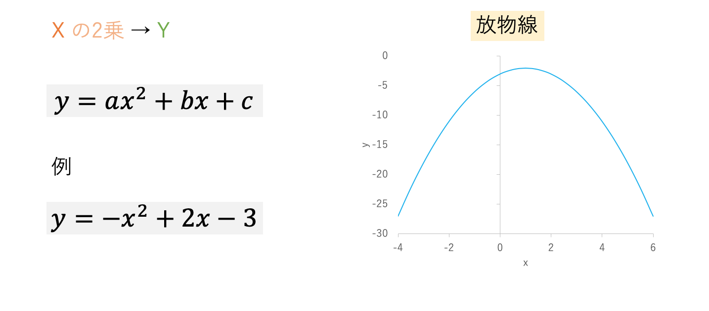 となります。下図はこの2次関数をグラフにしたものです。グラフは放物線になります。放物線とは、空に向かって投げたボールが描く軌跡です。$x^2$の項が加わっただけで、1次関数とは全く違った形になります。